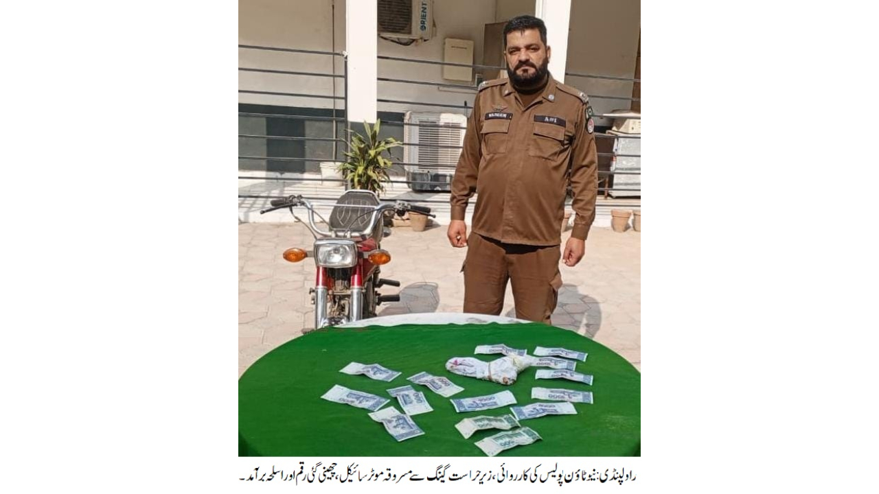 راولپنڈی (اردو ٹائمز) ایس ایچ او تھانہ نیوٹاؤن لقمان پاشا کی ہمراہ پولیس ٹیم کارروائی، سٹریٹ کرائم اور موٹر سائیکل چوری کی وارداتوں میں ملوث 2 رکنی گینگ گرفتار،مسروقہ موٹر سائیکل،چھینی گئی رقم 13 ہزار روپے اور اسلحہ برآمد۔تفصیلات کے مطابق نیوٹاؤن پولیس نے کارروائی کرتے ہوئے سٹریٹ کرائم اور موٹر سائیکل چوری کی وارداتوں میں ملوث 2 رکنی گینگ کو گرفتار کرلیا،مسروقہ موٹر سائیکل،چھینی گئی رقم 13 ہزار روپے اور اسلحہ برآمد ہوا،ایس پی راول سعد ارشد کاکہنا تھا کہ زیرحراست افراد کو ٹھوس شواہد کے ساتھ چالان عدالت کیا جائے گا،شہریوں کوقیمتی اثاثہ سے محروم کرنے والے افراد قانون کی گرفت سے نہیں بچ سکتے۔