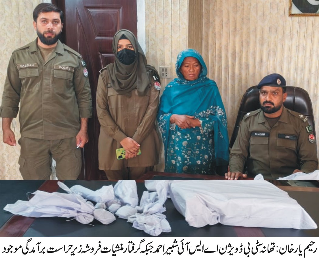 رحیم یارخان (اردو ٹائمز) تھانہ سٹی بی ڈویژن پولیس کی بڑی کارروائی 10 کلو سے زائد چرس برآمد خاتون منشیات فروشہ گرفتار، مقدمہ درج۔ ایس ایچ او تھانہ سٹی بی ڈویژن شکیل احمد اور ٹیم کی ڈی ایس پی سٹی راؤ دلشاد کی نگرانی میں منشیات فروشوں کے خلاف کارروائیاں جاری ہیں، گزشت روز اسسٹنٹ سب انسپکٹر شبیر احمد نے دیگر پولیس پارٹی کے ہمراہ دوران گشت و پڑتال جرائم مخبر سے اطلاع پاتے ہوئے قبرستال دڑی سانگی کے قریب کامیاب چھاپہ مار کارروائی کے دوران عادی و ریکارڈی بدنام خاتون منشیات فروشہ کرم خاتون زوجہ غلام حسین سانگی کو 10 کلو 270 گرام چرس برآمد ہونے پر حسب ضابطہ رنگے ہاتھوں گرفتار کرتے ہوئے مقدمہ درج کر لیا۔
