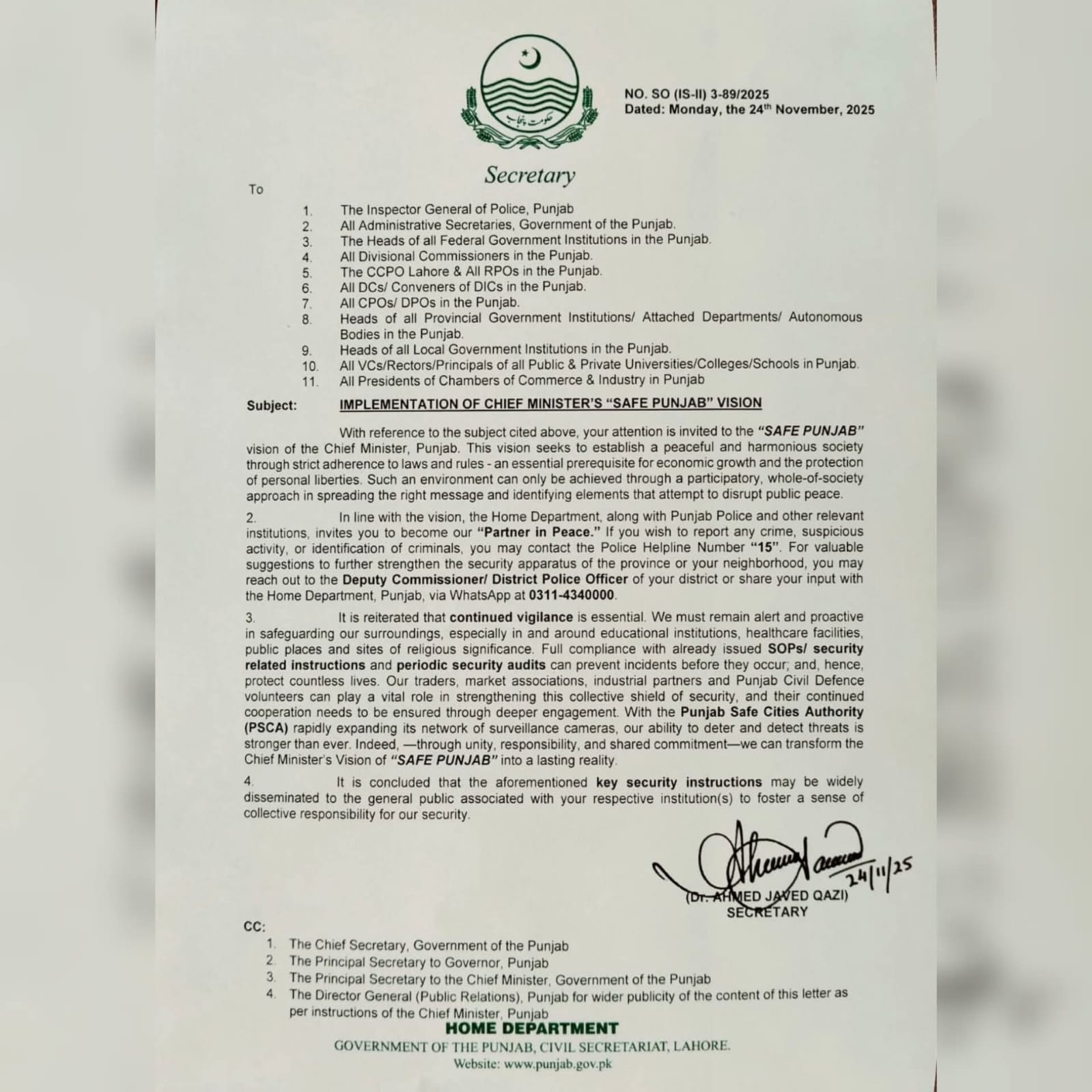 راولپنڈی (اردو ٹائمز) وزیراعلیٰ پنجاب کے “سیف پنجاب” وژن پر عملدرآمد وزیراعلی پنجاب کی ہدایت پر محکمہ داخلہ نے امن و امان کے قیام کے حوالے سے اہم مراسلہ جاری کر دیا جس کے ذریعے تمام اداروں اور عوام کو “پارٹنر اِن پیس” بننے کی دعوت دی گئی ہے۔ سکیورٹی کے حوالے سے مفید تجاویز کیلئے محکمہ داخلہ نے واٹس ایپ نمبر 03114340000 جاری کیا ہے جس پر شہری امن عامہ میں بہتری بارے قیمتی تجاویز تحریری طور پر بھجوا سکتے ہیں۔ شہری جرائم کی اطلاع، مشکوک سرگرمی یا ایمرجنسی کی صورت میں ہیلپ لائن “15” پر ہی رابطہ کریں گے