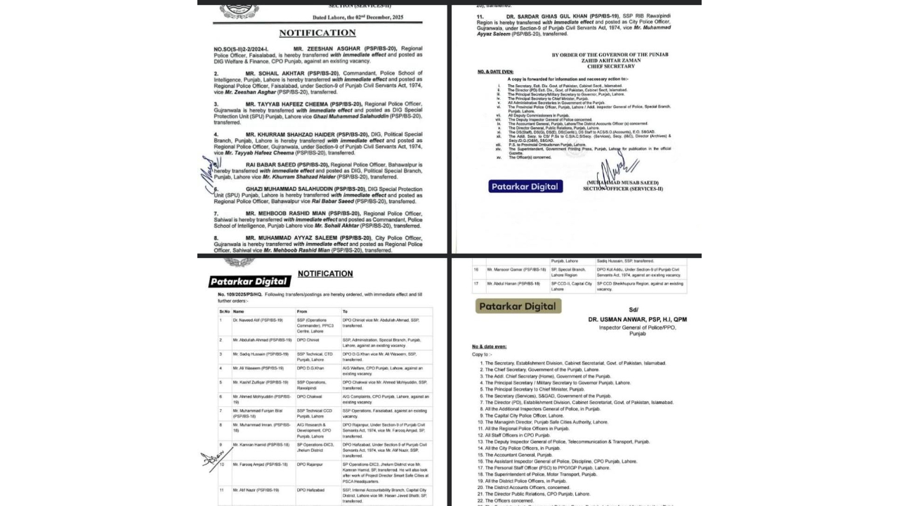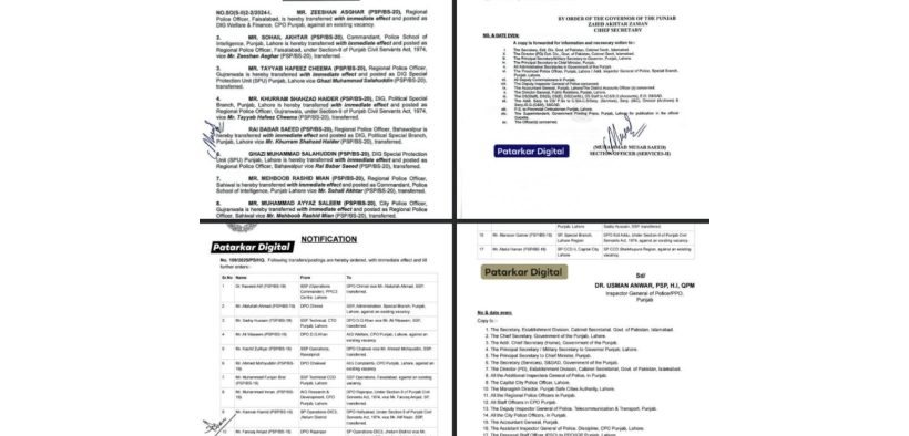 سہیل اختر سکھیرا کوآر پی او فیصل آباد،آر پی او گوجرانوالہ طیب حفیظ چیمہ کو ڈی آئی جی ایس پی یو،خرم شہزاد حیدر کوآر پی او گوجرانوالہ،آر پی او بہاولپوررائے بابر سعیدر کو ڈی آئی جی سپیشل برانچ، غازی محمد صلاح الدین کو آر پی او بہاولپور،سی پی او گوجرانوالہ رانا ایاز سلیم کو آر پی او ساہیوال،آر پی او ساہیوال محبوب رشید میاں کوکمانڈنٹ پولیس سکول آف انٹیلی جنس،سردار غیاث گل خان کو سی پی او گوجرانوالہ، آر پی او ڈی جی خان سجاد حسین منج کوتبدیل کرکے محمد اظہر اکرم کو آر پی او ڈی جی خان،ایس ایس پی نوید عاطف کو ڈی پی او چنیوٹ،ڈی پی او چنیوٹ عبداللہ احمد کو ایس ایس پی ایڈمن سپیشل برانچ لاہور،صادق حسین کو ڈی پی او ڈیرہ غازی خان،ڈی پی او ڈی جی خان علی وسیم کو اے آئی جی ویلفیئر سنٹرل پولیس آفس لاہور،کاشف ذوالفقار کو ڈی پی او چکوال،ڈی پی او چکوال احمد محی الدین کو اے آئی جی کمپلینٹس سنٹرل پولیس آفس لاہور،فرقان بلال کو ایس ایس پی آپریشنز فیصل آباد،محمد عمران کو ڈی پی او راجن پور،کامران حامد کو ڈی پی او حافظ آباد،ڈی پی او حافظ آباد عاطف نذیر کو ایس ایس پی انٹرنل اکاؤنٹیبلٹی سی سی پی او آفس لاہور،ڈی پی او راجن پور فاروق امجد کو ایس پی سیف سٹیز جہلم،حسن جاوید بھٹی کو ڈی پی او لیہ،رضا تنویر کو ڈی پی او مری،منصور قمر کو ڈی پی او کوٹ ادو،آصف آمین کو ایس ایس پی انویسٹی گیشن سی ٹی ڈی پنجاب، کامران ممتاز کو ایس ایس پی ٹیکنیکل سی ٹی ڈی لاہور جبکہ عبدالحنان کو اے ایس پی سی سی ڈی شیخوپورہ تعینات کر دیا گیاہے۔