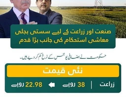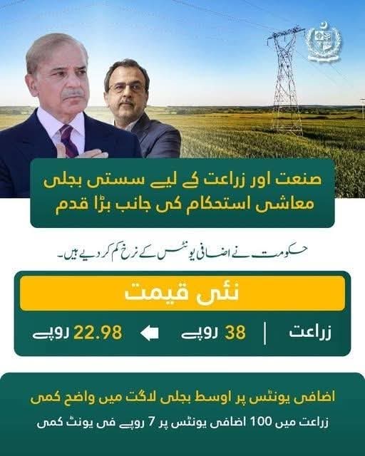 پاکستان اسلام آباد (اردو ٹائمز) حکومتِ پاکستان نے اضافی یونٹس میں کمی زراعت کے لیے 22.98 روپے کر دی گئ۔ Urdu Times 2025-12-12 Share اسلام آباد (اردو ٹائمز) حکومتِ پاکستان نے اضافی یونٹس میں کمی زراعت کے لیے 22.98 روپے کر دی گئ۔ وفاقی وزیر توانائی پاور ڈویژن سردار اویس احمد خان لغاری کی معیشت کے استحکام کی جانب اہم قدم