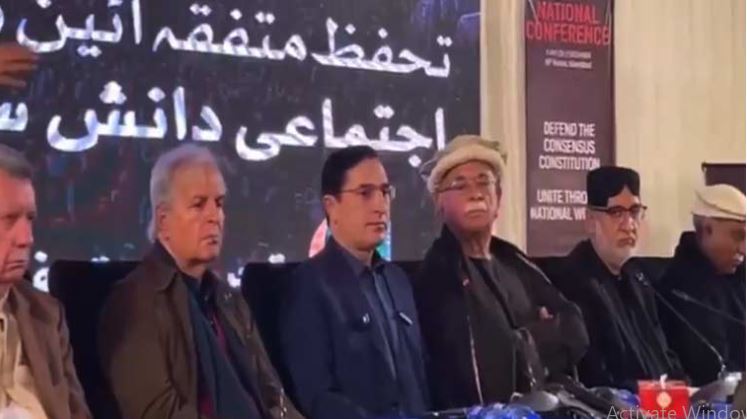 کانفرنس سے خطاب میں تحریک تحفظ آئین پاکستان کے سربراہ محمود خان اچکزئی نے کہا کہ آئیں ایک دوسرے کو معاف کریں ہم معاف کرتے ہیں، آئیں مل کر ملک پاکستان کو اس بربادی سے نکالیں، ہم جمہوری ڈائیلاگز کے لیے تیار ہیں، اگر کوئی مذاکرات کرنا چاہتا ہے عمران خان سے ملاقات کی اجازت دیں۔انہوں نے کہا کہ سزائیں تو آپ دے رہے ہیں مگر ملاقات تو فیملی اور قائدین کا حق ہے وہ تو دیں، مولانا فضل الرحمان، نواز شریف، جماعت اسلامی سمیت قائدین بیٹھیں اور بات کریں، 8 فروری کے الیکشن میں جس کی جیت ہوئی اسے الیکشن دے دیں۔انہوں نے کہا کہ 5309 ارب کی کرپشن کی رپورٹ سامنے آئی ہے، ہمارے ادارے ہماری آنکھیں ہیں اور ہمارے کان ہیں وہ اپنا کام ضرور کریں، سیاست میں مداخلت نہیں ہونی چاہیے۔