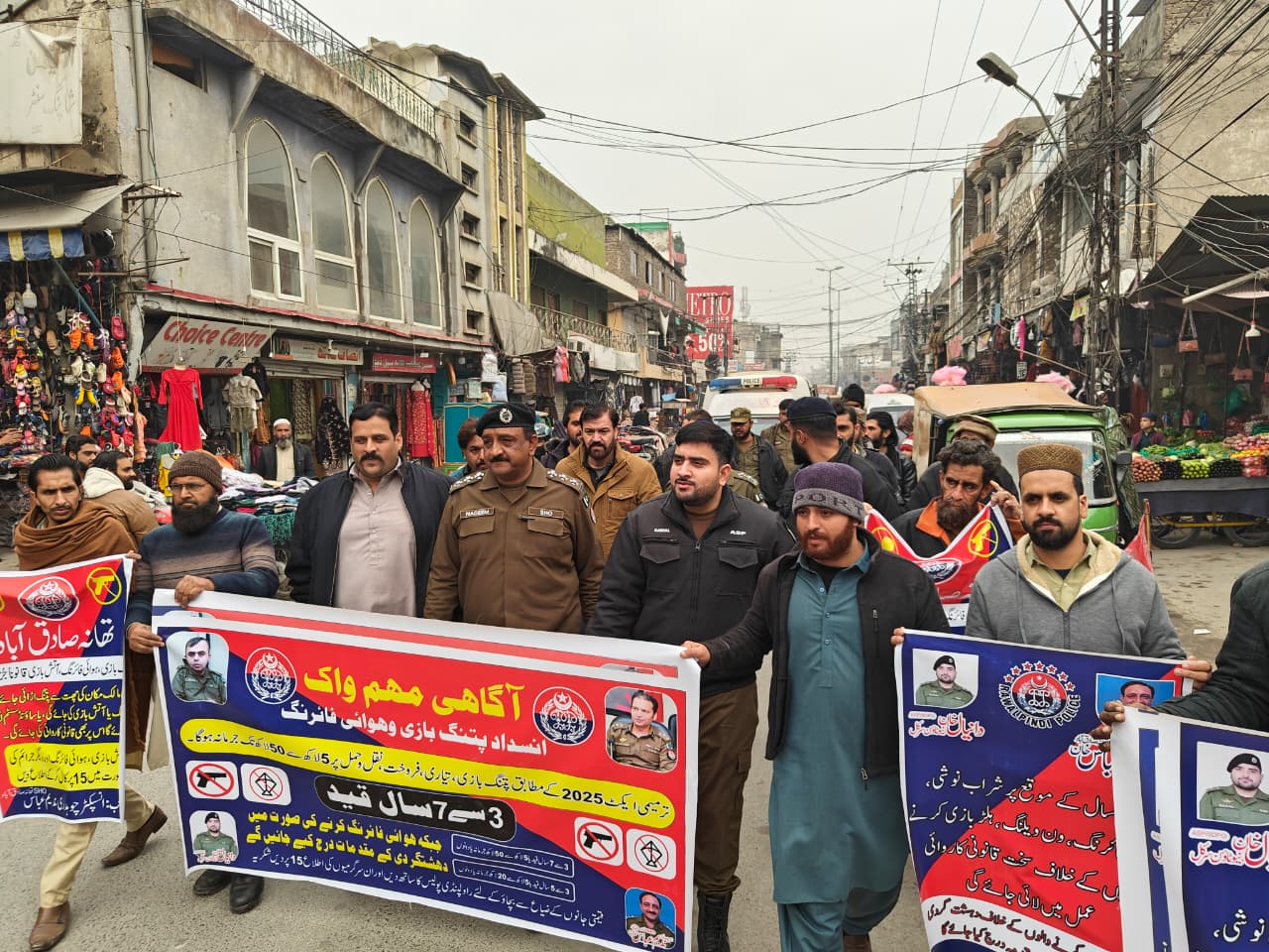 یونیورسٹی اور صادق آباد کے مختلف علاقوں میں کی گئی، آگاہی واکس میں اے ایس پی نیو ٹاؤن، ایس ایچ او صادق آباد ،ایرڈ ایگر یکلچر یونیورسٹی کی انتظامیہ، طلباءاور انجمن تاجران سمیت شہریوں کی کثیر تعداد نے شرکت کی، واک میں عوام الناس کو آگاہ کیا گیا کہ وہ نیو ایر نائٹ پر ہوائی فائرنگ آتش بازی اور کوئی بھی خلاف قانون حرکت ہرگز نہ کریں، خلاف ورزی کرنے والوں کے خلاف سخت قانونی کارروائی عمل میں لائی جائے گی