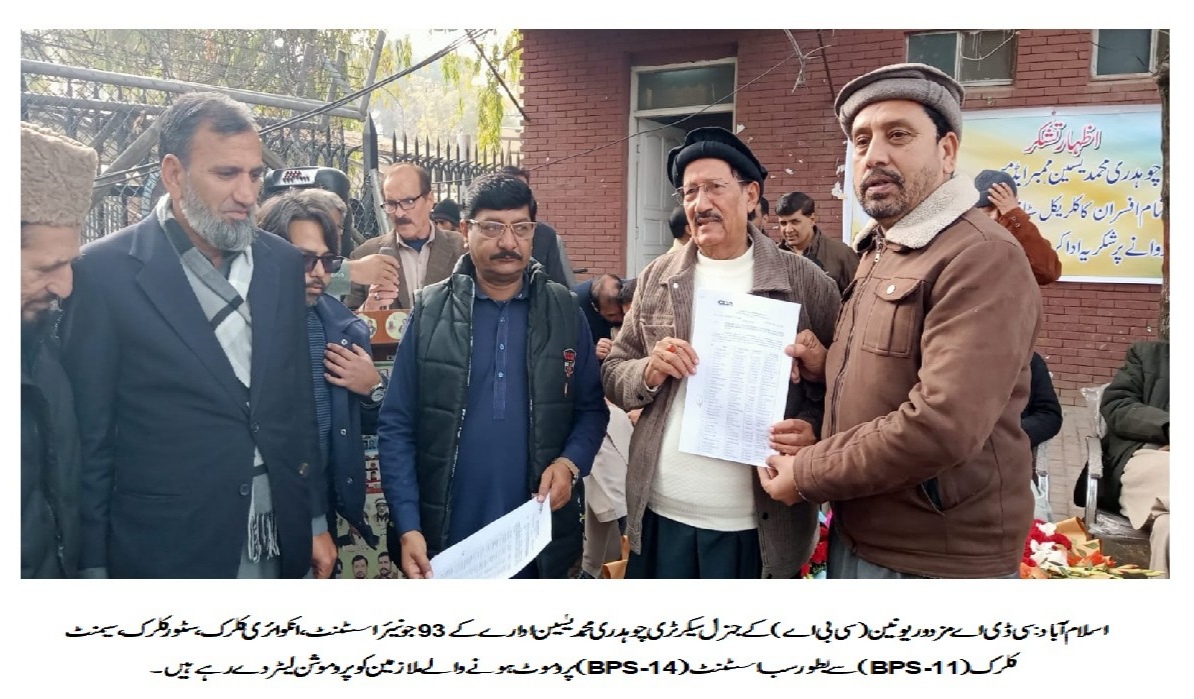 اسلام آباد (اردو ٹائمز) سی ڈی اے مزدور یونین (سی بی اے) کے زیر اہتمام ادارے کے 93جونیئراسسٹنٹ،انکوائری کلرک،سٹورکلرک،سیمنٹ کلرک (بی پی ایس-11)کی بطور سب اسسٹنٹ(بی پی ایس-14) پروموٹ ہونے والے ملازمین کو پروموشن لیٹر دینے کے حوالے سے تقریب