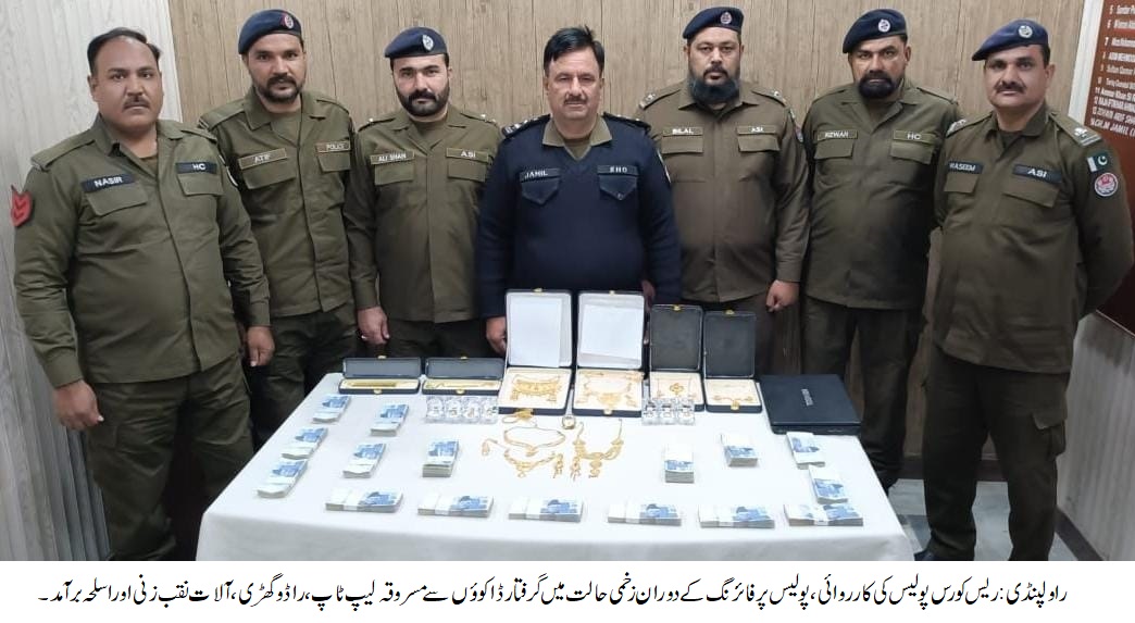 تھانہ ریس کورس پولیس نے ملزمان کی نشاندہی پر کارروائی کرتے ہوئے ایک کروڑ 40 لاکھ مالیت کے 30 تولہ مسروقہ طلائی زیورات، 16 لاکھ 63 ہزار رقم اور اسلحہ بھی برآمد کرلیا، زیر حراست افراد نے دوران تفتیش ڈکیتی اور چوری و نقب زنی کی متعدد وارداتوں کا انکشاف کیا، زیر حراست افراد کے انکشاف اور نشاندہی پر برآمدگی عمل میں لائی گئی، زیر حراست افراد کو ٹھوس شواہد کے ساتھ چالان عدالت کیا جائے گا،ایس پی پوٹھوہار طلحہ ولی