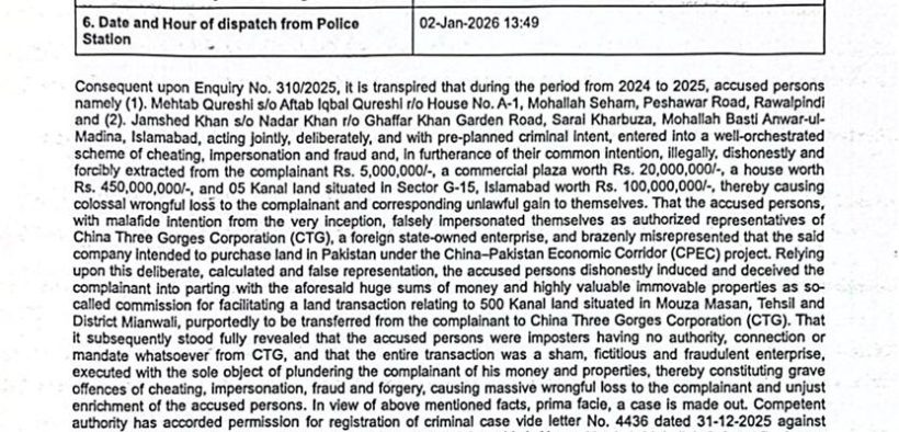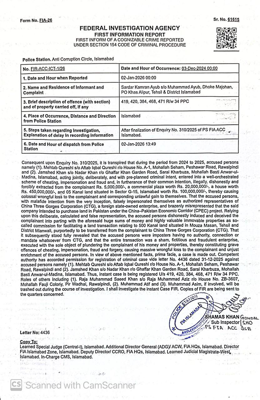 ایف آئی آر نمبر 1/26 کے مطابق، ایف آئی اے انکوائری نمبر 310/2025 مکمل ہونے پر یہ انکشاف ہوا کہ ملزمان راجہ سعید ، مہتاب قریشی اور جمشید خان نے باقاعدہ منصوبہ بندی کے تحت خود کو چائنہ تھری گورجز کارپوریشن کا مجاز نمائندہ ظاہر کیا اور مدعی مقدمہ سردار کامران ایوب کو یقین دلایا کہ چینی کمپنی سی پیک کے تحت پاکستان میں بڑے پیمانے پر زمین خریدنے جا رہی ہے۔