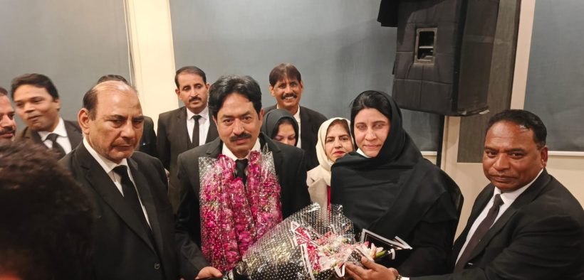 Rawalpindi (Urdu Times) Former presidential candidate of the Islamic Republic of Pakistan, Asghar Ali Mubarak, presents a bouquet to the newly elected President Tariq Mahmood Sajid Awan, Secretary General Qamar ul Haq Niazi, Vice President Shazia Yasmin Hashmi Shanze, Joint Secretary Ahsan Saleem Manj, Finance Secretary Abdul Quddus Chaudhry, and others on victory in the Rawalpindi District Bar Association elections.