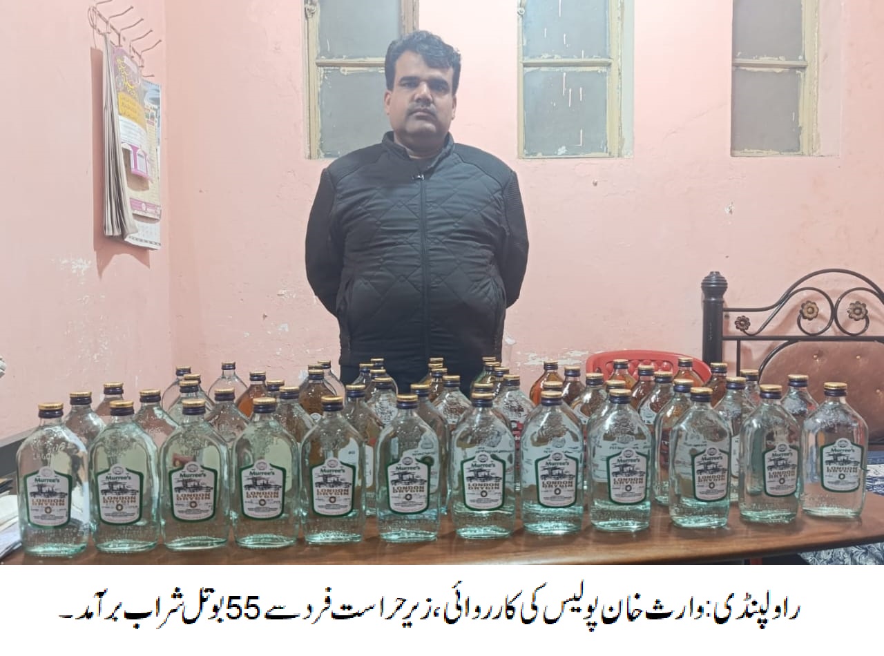 راولپنڈی (اردو ٹائمز) ایس ایچ او تھانہ وارث خان راجہ تصدق کی سربراهی میں پولیس ٹیم کی کارروائی، شراب سپلائر گرفتار،55بوتل شراب برآمد۔ تفصیلات کے مطابق وارث خان پولیس نے کارروائی کرتے ہوئے شراب سپلائر کو گرفتار کرلیا، زیرحراست شراب سپلائر سے55بوتل شراب برآمدہوئی، وارث خان پولیس نے مقدمہ درج کرکے گرفتارکرلیا،ایس پی راول سعد ارشد کاکہنا تھا کہ زیرحراست فرد کوٹھوس شواہد کے ساتھ چالان عدالت عدالت کیا جائے گا،منشیات کے ناسور کے خاتمے کے لیے تمام اقدامات اٹھائے جا رہے ہیں۔