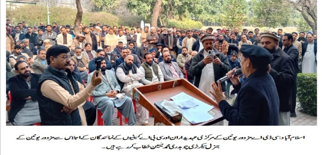 سی ڈی اے مزدور یونین کے مرکزی عہدیداران اور سی بی اے کمیٹیوں کے نمائندگان کا ایک اہم اجلاس مرکزی یونین آفس مین چیئرمین آفس کمپلیکس میں منعقد ہوا جس کی صدارت یونین کے صدر اورنگزیب خان نے کی۔ اجلاس میں سی ڈی اے مزدور یونین کے مرکزی عہدیداران، سی بی اے کمیٹیوں کے نمائندگان اور ملازمین کی کثیر تعداد نے شرکت کی۔اجلاس سے خطاب کرتے ہوئے سی ڈی اے مزدور یونین کے جنرل سیکرٹری چوہدری محمد یٰسین نے کہا کہ سی ڈی اے مزدور یونین نے بطور نمائندہ تنظیم سی ڈی اے انتظامیہ کے ساتھ مزدوروں کے مسائل کے حل کے لیے جوائنٹ ورک کونسل کا اجلاس منعقد کیا جس پر ہم انتظامیہ کے شکرگزار ہیں کہ انہوں نے تمام مطالبات پر مثبت انداز میں مذاکرات کیے اور ان کے حل کے لیے فوری ہدایات جاری کیں۔انہوں نے کہا کہ سی ڈی اے مزدور یونین کے مطالبے پر لائن آف پروموشن سمیت ملازمین کے دیگر مسائل کو سی ڈی اے بورڈ سے حل کروانے پر ہم انتظامیہ کے تہہ دل سے مشکور ہیں جس سے یقینی طور پر ملازمین کی عرصہ دراز سے رکی ہوئی ترقیاں ممکن ہو سکیں گی اور ان کا مستقبل روشن ہوگا۔چوہدری محمد یٰسین نے مزید کہا کہ ملازمین کے پلاٹوں کا کیس عدالتوں میں زیرِ سماعت ہے اور ہم انتظامیہ سے مطالبہ کرتے ہیں کہ وہ اس معاملے میں بھی ذاتی دلچسپی لے اور عدالتی فیصلوں کا احترام کرتے ہوئے فوری طور پر قرعہ اندازی کا عمل مکمل کیا جائے۔ اس موقع پر انہوں نے مطالبہ کیا کہ سینی ٹیشن سمیت تمام فیلڈ اسٹاف جو مقررہ اوقات کار سے زائد خدمات انجام دیتا ہے انھیں انتظامیہ اوورٹائم اور دیگر مراعات فراہم کرے تاکہ مزدور معاشی طور پر مستحکم ہو سکیں۔انھوں نے کہا کہ سی ڈی اے مزدور یونین مزدوروں کے حقوق کے لیے اپنی جدوجہد جاری رکھے گی اور ان شاء اللہ باقی ماندہ مسائل بھی جلد حل کروائے جائیں گے۔اجلاس کے آخر میں سی ڈی اے مزدور یونین کے سابق سرپرستِ اعلیٰ الحاج راجہ محمد رفیق، عابد فورمین انوائرمنٹ کے والد، منظور حسین ڈپٹی ڈائریکٹر سیکیورٹی کی والدہ، سلیم بھٹی کی والدہ،صدرسی بی اے کمیٹی ملک احسان کی والدہ اور داؤد حسین شاہ کے انتقال پر مرحومین کی مغفرت کے لیے اجتماعی دعا کی گئی۔