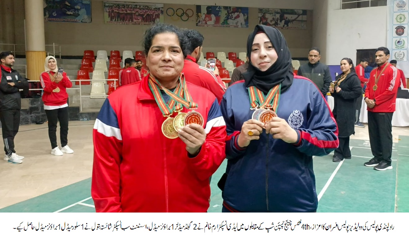 راولپنڈی (اردو ٹائمز)(مظہر شاہ )راولپنڈی پولیس کی دو لیڈیز پولیس افسران کا اعزاز، لیڈی انسپکٹر ارم خانم نے 4واں فٹنس چیلنج چمپئن شپ کے مقابلوں میں 2 گولڈ میڈل اور 1 براؤنز میڈل حاصل کیا،اسسٹنٹ سب انسپکٹر شائستہ بتول نے 1 سلور میڈل اور 1 براؤنز میڈل حاصل کیا۔ تفصیلات کے مطابق راولپنڈی پولیس کی دو لیڈیز پولیس افسران کا اعزاز، لیڈی انسپکٹر ارم خانم نے 4thفٹنس چیلنج چمپئن شپ کے مقابلوں میں 2 گولڈ میڈل اور 1 براؤنز میڈل حاصل کیا،اسسٹنٹ سب انسپکٹر شائستہ بتول نے 1 سلور میڈل اور 1 براؤنز میڈل حاصل کیا، مقابلوں کا انعقاد 2 فروری 2026 کو پشاور میں ہوا،پولیس افسران کو کھیلوں کے مواقع فراہم کر کے انکی صلاحیتوں کو سامنے لانے کے لئے راولپنڈی پولیس تمام وسائل بروئے کار لا رہی ہے۔
