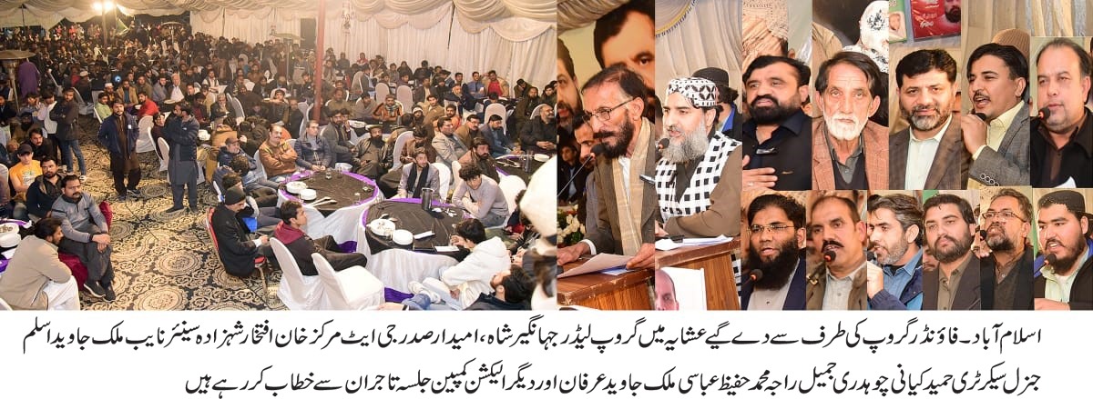 اسلام آباد (اردو ٹائمز) آج مورخہ پانچ فروری بروز بدھ ٹریڈر ویلفیر ایسوی ایشن جی ایٹ مرکز الیکشن 2026/2028 کا آخری جلسہ منعقد کیا گیا جس میں جی ایٹ مرکز کے تاجران کی بھاری اکثریت نے شرکت کی۔ فاونڈر گروپ کے گروپ لیڈر جہانگیر شاہ۔ پیٹران چیف چوہدری جمیل رمضان۔ چیرمین فاونڈر گروپ راجہ محمد حفیظ عباسی صدر فاونڈر گروپ خان افتخار شہزادہ۔ جنرل سیکٹری حمید کیانی۔ ایڈینشل جنرل سیکٹری فاونڈر گروپ چوہدری جہانگیر۔ سئنیر نائب پریذیٹنٹ ملک جاوید اسلم۔ نائب صدر شوکت عباسی۔ نائب صدر محمد رمضان۔ نائب صدر عرفان چینی۔ نائب صدر ییخی استاد۔ جوائنٹ سیکرٹری سردار عمران۔ سیکٹری انفارمیشن تنویر احمد ستی اور دیگر تمام عہددران نے شرکت کی۔ اور تمام عہدارنوں نے خطاب کیا۔ الیکشن میں تین گروپ آمنے سامنے ہیں۔ جس میں فاونڈر گروپ انتخابی نشان قلم کا پلہ بھاری ہیں۔ جس میں دوسرے گروپ کا تاجر اتحاد گروپ انتخابی نشان چھتری ہیں۔ تیسرا گروپ تاجر انصاف گروپ ہیں جس کا انتخابی نشان شاہین ہیں۔