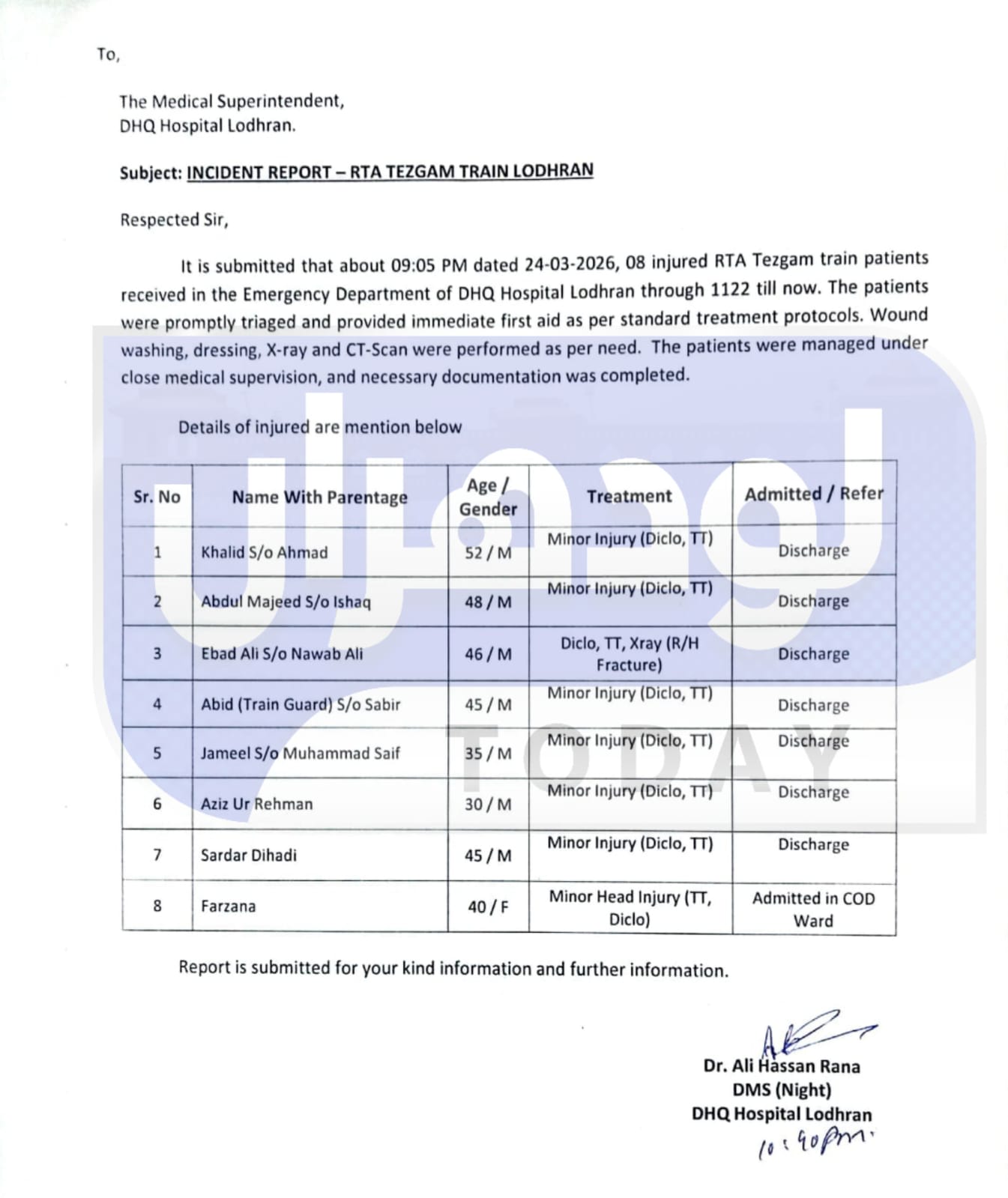 لودھراں (اردو ٹائمز) آدم واہن کے قریب تیز گام ایکسپریس حادثے کا شکار