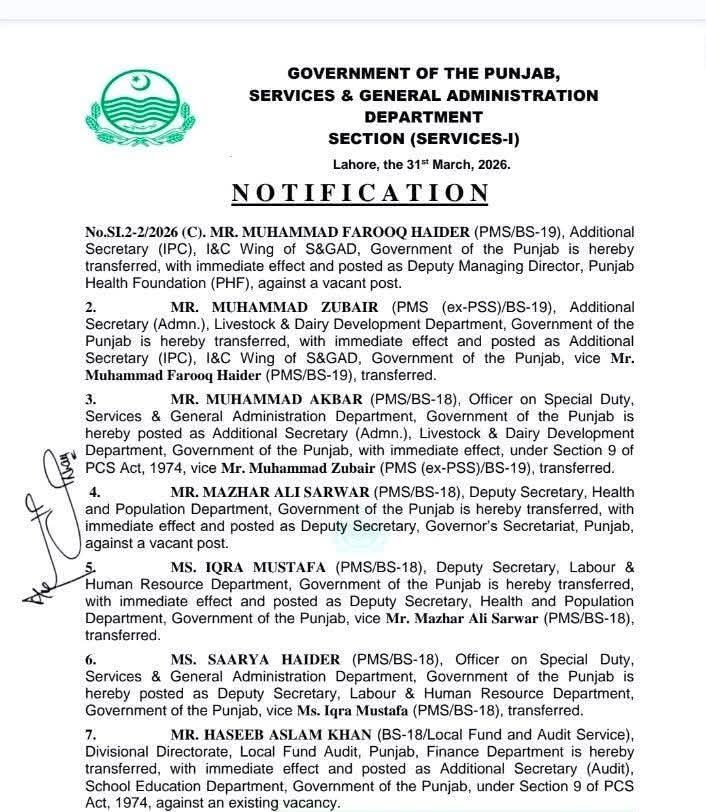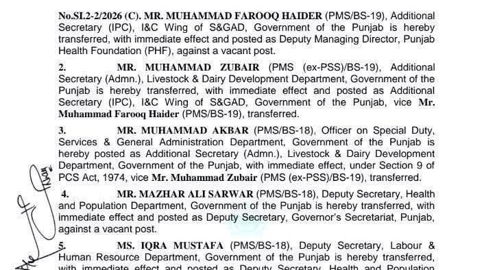 لاہور (اردو ٹائمز) پنجاب حکومت میں بڑے پیمانے پر افسران کے تقرر و تبادلے کر دیے