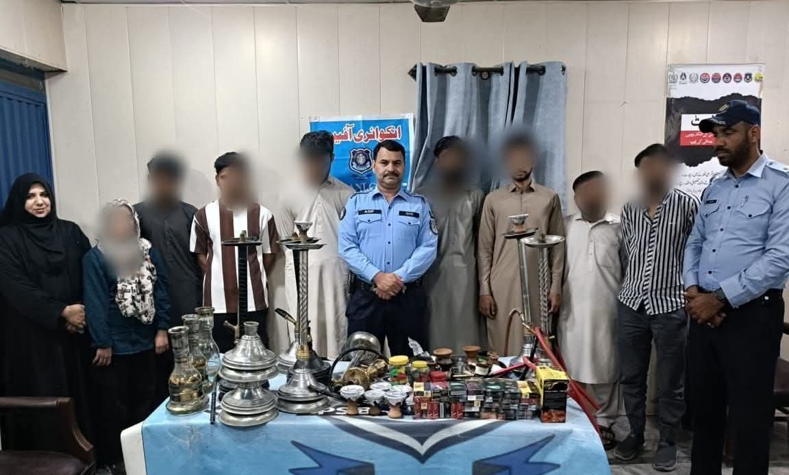 ایس ایچ او انسپکٹر آصف خان کی قیادت میں کی گئی کارروائی کے دوران 9 سٹیل کے حقے، 3 شیشے کے حقے، 30 فلیور ڈبیاں، 7 پلاسٹک پائپ اور 15 ٹوپیاں برآمد کی گئیں۔