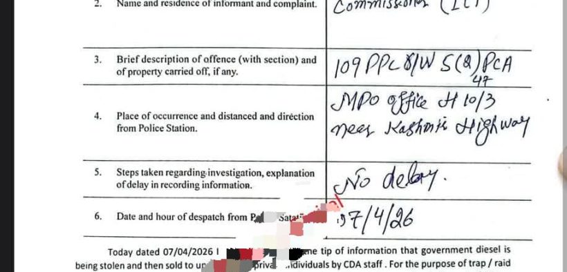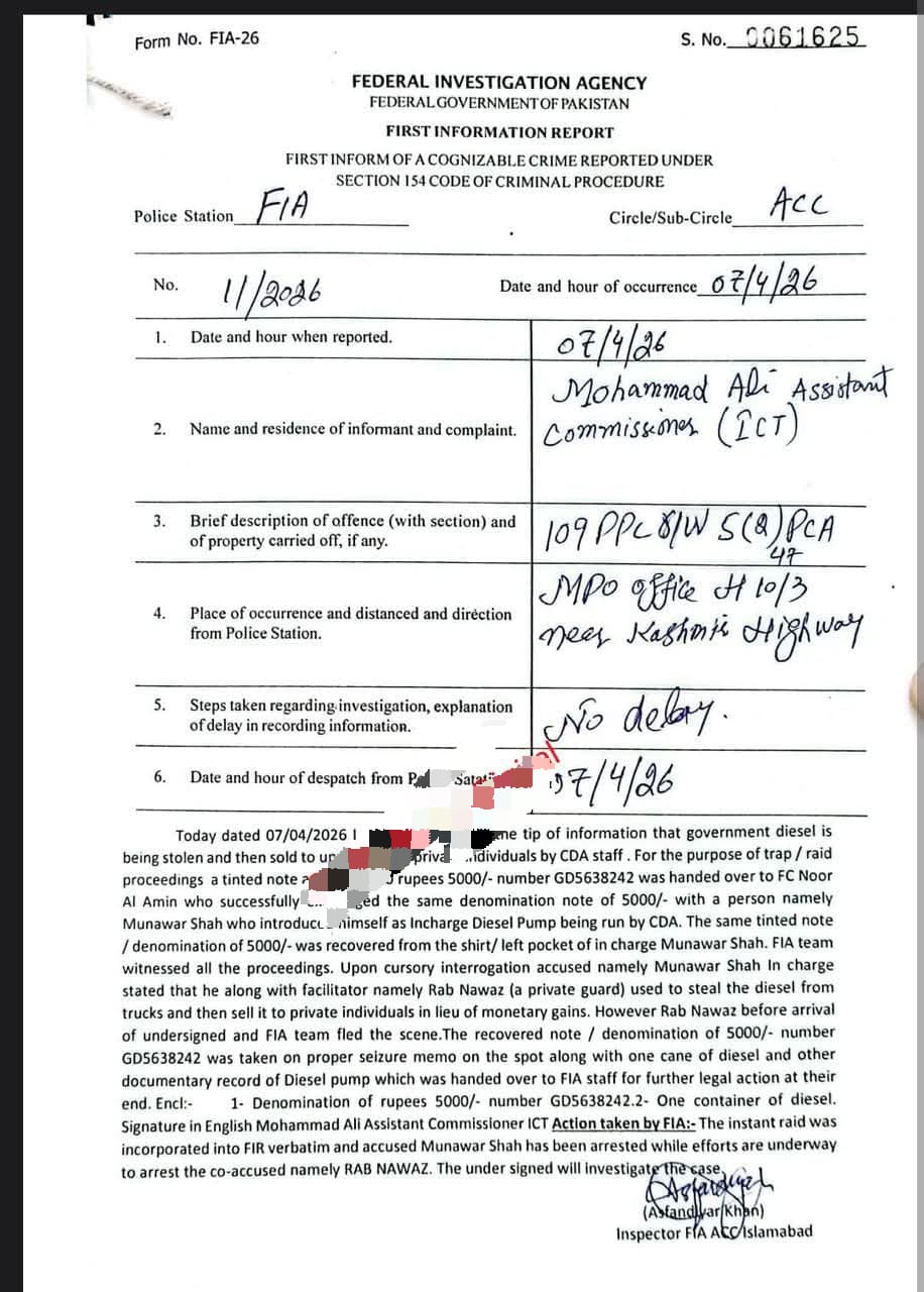 اسلام آباد (اردو ٹائمز): سی ڈی اے کا سرکاری ڈیزل چوری اسکینڈل بے نقاب، ایف آئی اے کی کارروائی،ایک ملزم گرفتار،دوسرا عادی ملزم رب نواز گارڈ فرار اسلام آباد میں فیڈرل انویسٹیگیشن ایجنسی (ایف آئی اے) نے سی ڈی اے کے سرکاری ڈیزل کی چوری اور غیرقانونی فروخت میں ملوث گروہ کے خلاف بڑی کارروائی کرتے ہوئے ایک ملزم کو گرفتار کر لیا جبکہ اس کا ساتھی فرار ہو گیا۔تفصیلات کے مطابق ایف آئی اے نے مقدمہ نمبر 11/2026 مورخہ 07 اپریل 2026 درج کیا، جس کی اطلاع اسسٹنٹ کمشنر اسلام آباد محمد علی کی جانب سے دی گئی۔ رپورٹ کے مطابق ایف آئی اے کو خفیہ اطلاع ملی کہ سرکاری ڈیزل چوری کرکے نجی افراد کو فروخت کیا جا رہا ہے۔اطلاع ملنے پر ایف آئی اے ٹیم نے اسلام آباد کے علاقے ایم پی او آفس H-10/3، کشمیر ہائی وے کے قریب چھاپہ مار کارروائی کی۔ کارروائی کے دوران ٹریپ کے طور پر 5000 روپے کا نشاندہی شدہ نوٹ ایف سی اہلکار کے ذریعے ملزم کو دیا گیا۔ ملزم نے خود کو سی ڈی اے کے زیر انتظام ڈیزل پمپ کا انچارج ظاہر کیا۔ چھاپے کے دوران مذکورہ 5000 روپے کا نوٹ ملزم منور شاہ کی جیب سے برآمد کر لیا گیا، جبکہ ایک ڈیزل سے بھرا کنٹینر اور ریکارڈ بھی قبضے میں ل