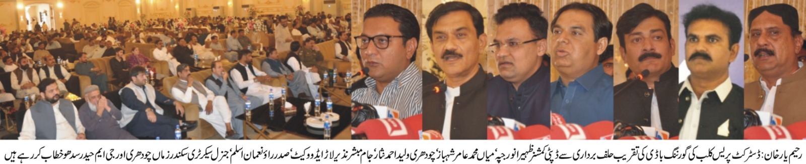 رحیم یارخان (اردو ٹائمز) ڈسٹرکٹ پریس کلب (رجسٹرڈ) رحیم یار خان کی نو منتخب گورننگ باڈی کی باوقار تقریبِ حلف برداری، ڈپٹی کمشنر ظہیر انور جپہ اور میاں عامر شہباز نے نو منتخب عہدیداران سے حلف لیا، یادگاری شیلڈز کی تقسیم کی گئیں، شہری مسائل کے حل اور مثبت امیج اجاگر کرنے میں انتظامیہ اور صحافی برادری کا باہمی تعاون کو مزید فروغ دیا جائے گا، ڈپٹی کمشنر کا خطاب، پریس کلب کی نئی قیادت صحافتی اقدار کو مضبوط کرے گی، میاں عامر شہباز، تاجر، وکلاء اور صحافی سچ کے علمبردار ہیں، ولید نثار، مبشر لاڑ،