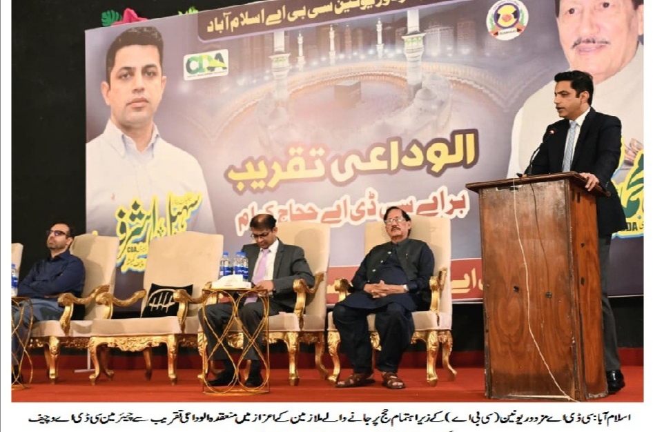 اسلام آباد ( ) سی ڈی اے مزدور یونین (سی بی اے) کے زیر اہتمام حج پر جانے والے ملازمین کے اعزاز میں مقامی ہوٹل میں الوداعی تقریب کا انعقاد کیا گیا۔ تقریب کے مہمانِ خصوصی چیئرمین سی ڈی اے و چیف کمشنر اسلام آباد لیفٹیننٹ (ر) سہیل اشرف تھے۔تقریب میں سی ڈی اے کے ممبر ایڈمنسٹریشن اسفند یار بلوچ، ممبر فنانس و پلاننگ محمد عمیر، ممبر اسٹیٹ زمان وٹو، ڈائریکٹر تعلقاتِ عامہ شاہد رفیق کیانی، ڈپٹی ڈائریکٹر کامران اسلم، ڈائریکٹر لیبر ریلیشن آصف علی خان، پیر قاری عبید احمد عبید نقشبندی،علامہ جہانگیر شاہ سعیدی،سی ڈی اے مزدور یونین کے چیئرمین راجہ شاکر زمان کیانی، سپریم ہیڈ مرزا سعید اختر، حاجی صابر، صوفی محمود علی، اظہار عباسی، راجہ شفیق، نعیم کیانی، سید مقبول شاہ، چوہدری واجد گجر، چوہدری ابرار، اسد محمود، محمد سرفراز ملک سمیت سی ڈی اے مزدور یونین کے عہدیداران، سی بی اے کمیٹیوں کے نمائندگان اور ملازمین نے کثیر تعداد میں شرکت کی۔تقریب سے خطاب کرتے ہوئے سی ڈی اے مزدور یونین (سی بی اے) کے جنرل سیکرٹری چوہدری محمد یاسین نے کہا کہ ہم چیئرمین سی ڈی اے و چیف کمشنر لیفٹیننٹ (ر) سہیل اشرف کے انتہائی مشکور ہیں جنہوں نے سی ڈی اے مزدور یونین کی درخواست پر اس پروگرام میں خصوصی شرکت کی۔ اس موقع پر انھوں نے حج پر جانے والے تمام ملازمین کو مبارکباد پیش کرتے ہوئے کہا کہ چیئرمین سی ڈی اے اور مزدور یونین کی کاوشوں سے ہر سال ادارے کے ملازمین کو قرعہ اندازی کے ذریعے حج کیلئے بھیجا جاتا ہے جو ایک بڑی سعادت ہے۔انہوں نے مزید کہا کہ سی ڈی اے مزدور یونین کا بنیادی مقصد رنگ، نسل اور مذہب سے بالاتر ہو کر مزدوروں کی خدمت کرنا ہے اور ہم نے یہ سب اپنے عمل سے ثابت کیا ہے۔مزدور یونین مذاکرات پر یقین رکھتی ہے اور ملازمین کے حقوق کے تحفظ کیلئے عملی جدوجہد جاری رکھے گی۔انہوں نے کہا کہ چیئرمین سی ڈی اے دن رات ادارے کی ترقی کیلئے کوشاں ہیں اور ہم ان کی خدمات کو خراجِ تحسین پیش کرتے ہیں۔ سی ڈی اے کے تمام ملازمین ادارے کی ترقی اور وزیرِ اعظم کے ویژن کے مطابق وزیرِ داخلہ اور چیئرمین سی ڈی اے کی قیادت میں اسلام آباد کو خوبصورت اور صاف ستھرا شہر بنانے کیلئے ان کے شانہ بشانہ کھڑے ہیں۔تقریب سے خطاب کرتے ہوئے چیئرمین سی ڈی اے لیفٹیننٹ (ر) سہیل اشرف نے کہا کہ اللہ تعالیٰ کی سرزمین پر وہی شخص جا سکتا ہے جسے اللہ تعالیٰ خود منتخب کرتا ہے۔ انہوں نے کہا کہ حج پر جانے والے ملازمین اپنے ساتھ ساتھ اپنے اہلِ خانہ، وطنِ عزیز پاکستان اور ادارے (سی ڈی اے) کی ترقی کیلئے بھی دعائیں کریں۔انہوں نے کہا کہ تمام ملازمین ایمانداری کے ساتھ اپنے فرائض منصبی اداکریں اور ادارے کی بہتری کیلئے اپنی تمام صلاحیتیں بروئے کار لائیں۔ ادارے کے ملازمین کا حق ہے کہ وہ اپنے جائز مطالبات کیلئے ہمارے پاس آئیں اور ان شاء اللہ ان کے جائز مطالبات نیک نیتی کے ساتھ حل کیے جائیں گے۔ چیئرمین سی ڈی اے نے کہا کہ ادارے کا عزم ہے کہ اسلام آباد کو دنیا کا خوبصورت اور جدید ترین دارالحکومت بنایا جائے جس کیلئے ہم سب کو مل کر دن رات محنت کرنا ہوگی کیونکہ محنت میں ہی عظمت ہے۔ انہوں نے مزید کہا کہ سی ڈی اے کے گورننس ماڈل کو بہتر سے بہترین بنانے کیلئے کوششیں جاری ہیں تاکہ شہریوں کو اعلیٰ اور معیاری سہولیات کی فراہمی یقینی بنائی جا سکے۔تقریب کے اختتام پر حج کی سعادت حاصل کرنے والے ملازمین میں لازمی سفری اشیاء اور تحائف بھی تقسیم کیے گئے۔