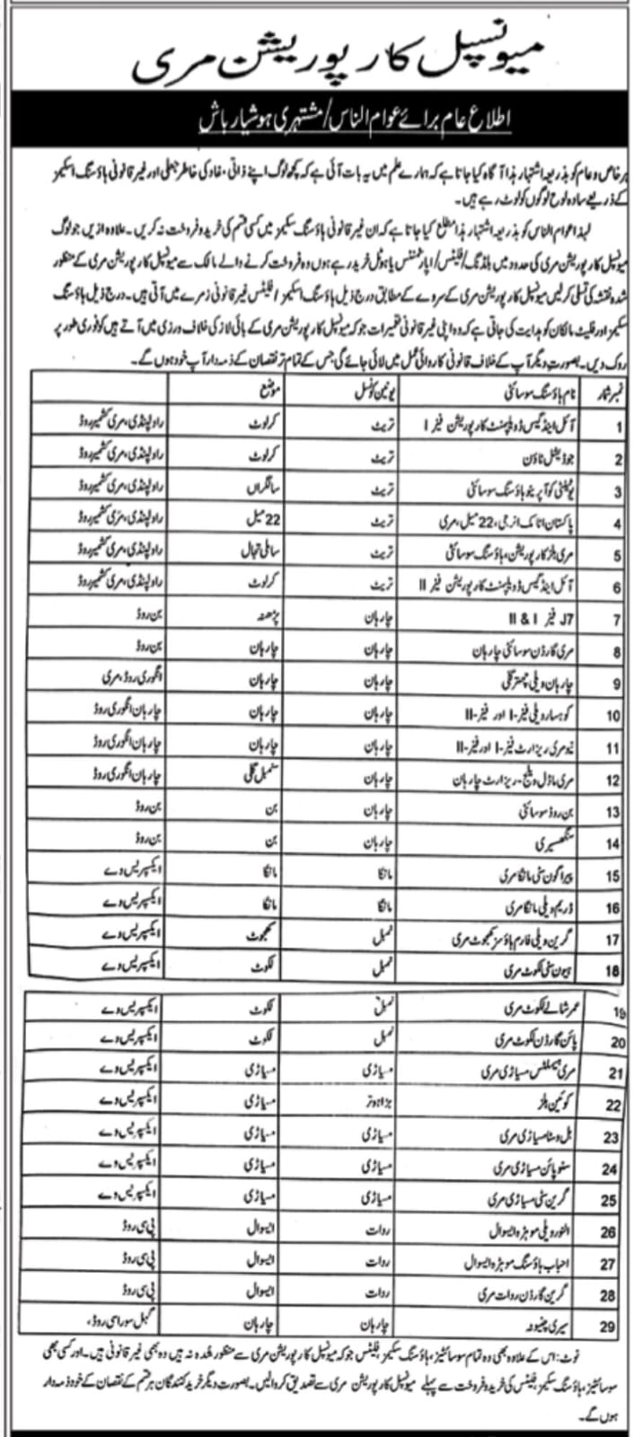 میونسپل کارپوریشن کے مطابق مذکورہ ہاؤسنگ سوسائٹیز نہ صرف متعلقہ قوانین اور ضوابط کی خلاف ورزی کر رہی ہیں بلکہ سادہ لوح شہریوں کو سبز باغ دکھا کر ان سے بھاری رقوم بٹور رہی ہیں۔ حکام نے واضح کیا ہے کہ ان غیر قانونی سکیموں کے خلاف مزید سخت قانونی کارروائی عمل میں لائی جائے گی۔اعلامیے میں متعلقہ ہاؤسنگ سوسائٹیز کے مالکان و منتظمین کو ہدایت جاری کی گئی ہے کہ وہ فوری طور پر پلاٹس کی غیر قانونی خرید و فروخت بند کریں، بصورت دیگر ان کے خلاف سخت ایکشن لیا جائے گا جس میں جرمانے، مقدمات اور دیگر قانونی اقدامات شامل ہو سکتے ہیں۔دوسری جانب اس معاملے پر ردعمل دیتے ہوئے علاقے کے لمبردار جاوید اقبال عباسی نے میونسپل کارپوریشن مری کے اس اقدام کو سراہتے ہوئے اسے بروقت اور عوامی مفاد میں قرار دیا ہے۔ انہوں نے کہا کہ وہ عرصہ دراز سے ان غیر قانونی ہاؤسنگ سوسائٹیز کے خلاف آواز اٹھا رہے ہیں اور متعدد بار متعلقہ اداروں کو تحریری طور پر آگاہ کر چکے ہیں۔لمبردار جاوید اقبال عباسی کے مطابق مذکورہ اراضی کھیوٹ نمبر 103 بمطابق مثل حقیقت 1956/57 کے تحت ان کی جدی و ملکیتی نوتوڑ شاملات شاملات ہے، جس پر ان کے والد محمد یوسف اور ان کے اپنے حق میں عدالتوں سے دو مرتبہ ڈگریاں بھی حاصل ہو چکی ہیں۔ ان کا کہنا تھا کہ اس کے باوجود بااثر عناصر نے غیر قانونی طور پر زمین پر قبضہ کر کے ہاؤسنگ سوسائٹیز قائم کر رکھی ہیں اور شہریوں کو گمراہ کر رہے ہیں۔انہوں نے مطالبہ کیا کہ ضلعی انتظامیہ اور متعلقہ ادارے فوری طور پر کارروائی کرتے ہوئے ان کی زمین کو قبضہ مافیا سے واگزار کرائیں اور ان کا قانونی و آئینی حق انہیں دلایا جائے۔